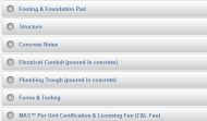 Concrete (shotcrete) – 3/8 inch to 5/16 inch (11/32 inch ± 1/16 inch) 18 cubic yards 38 cubic yards Concrete (shotcrete) – 3/8 inch to 5/16 inch (11/32 inch ± 1/16 inch) with Optional Roof Eve System 2.1 cubic yards 2.1 cubic yards Concrete Admix water proofing (consult engineer) consult with engineer consult with engineer Rebar – #3 (0.375 inch) 1,702 linear feet 4,010 linear feet Rebar – #3 (0.375 inch) with Optional Roof Eve System 720 linear feet 720 linear feet MAS-HELIX™ (Average) 307 lbs 558 lbs MAS-HELIX™ with Optional Roof Eve System 31.5 lbs 31.5 lbs Rebar Wire Ties 90 pieces 200 pieces Rebar Chairs – 1-1/2 inch plastic 35 pieces 65 pieces - Concrete Notes